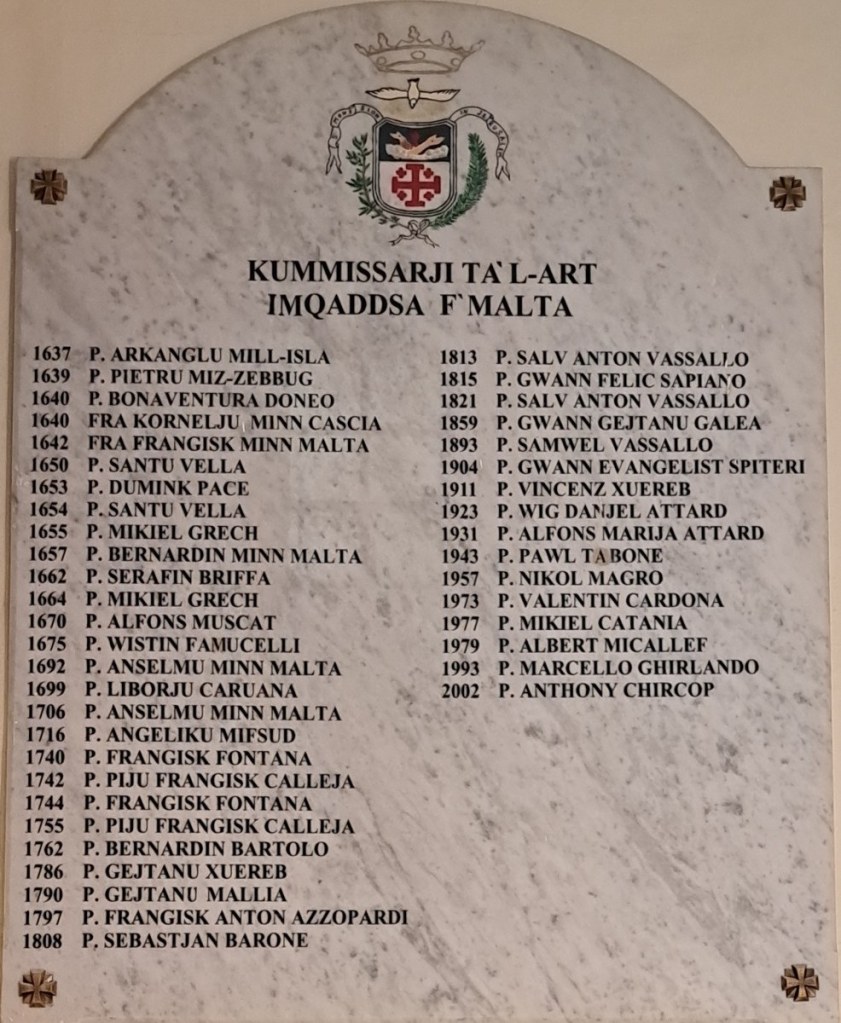 On 26 February 1636 the Holy Land Commissary in Malta, Fr. Cornelio da Cassia bought a house adjacent to Ta’ Ġieżu Franciscan Friary in what is now Santa Luċija Street, Valletta. The house belonged to Caterina Metaxi, wife of the Greek Catholic Papas. After solving legal matters in which the Congregation of Propaganda Fide was involved, and after relinquishing some rooms in the friary which had served as a Commissariat, by 1656 this building became the official residence of the Commissary of the Holy Land, and it still serves this purpose. The house, which is connected internally with the friary itself, became an Hospitium Terræ Sanctæ, that is, a hospice where missionaries to the Holy Land would stop in Malta on their way to Palestine or on their way back to Italy. Its rank as a Commissariat was similar to the General Commissariats of Palermo, Naples and Venice, which also catered for missionaries going to the Holy Land.