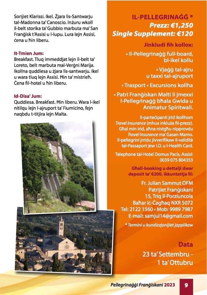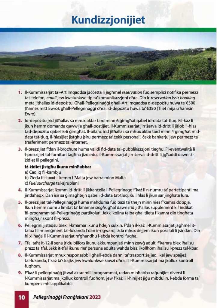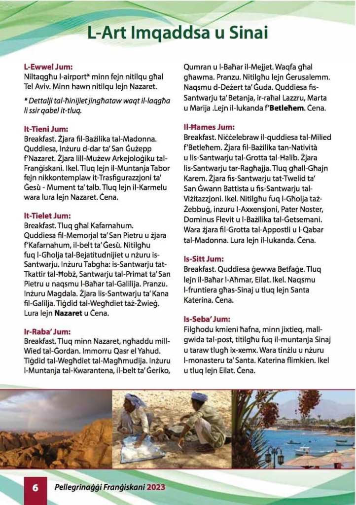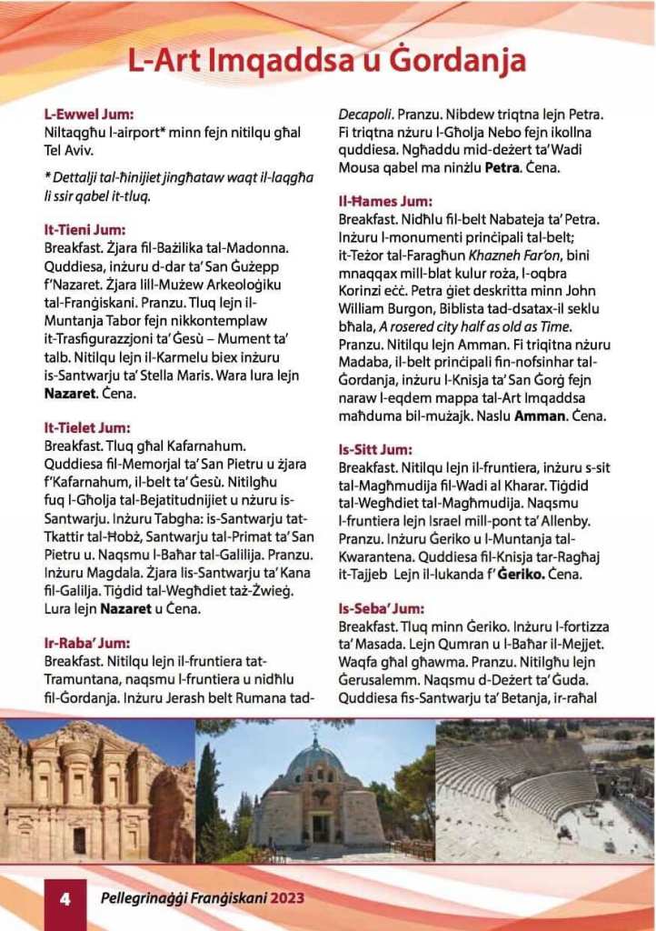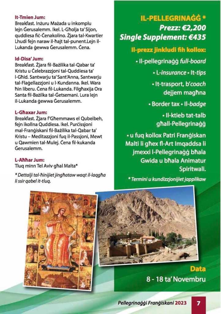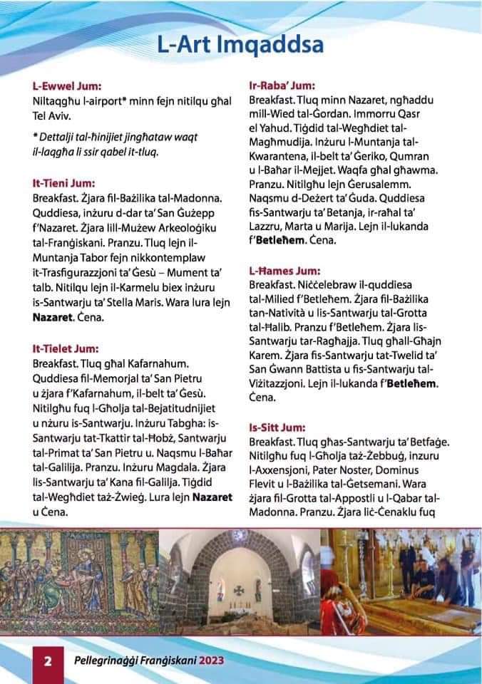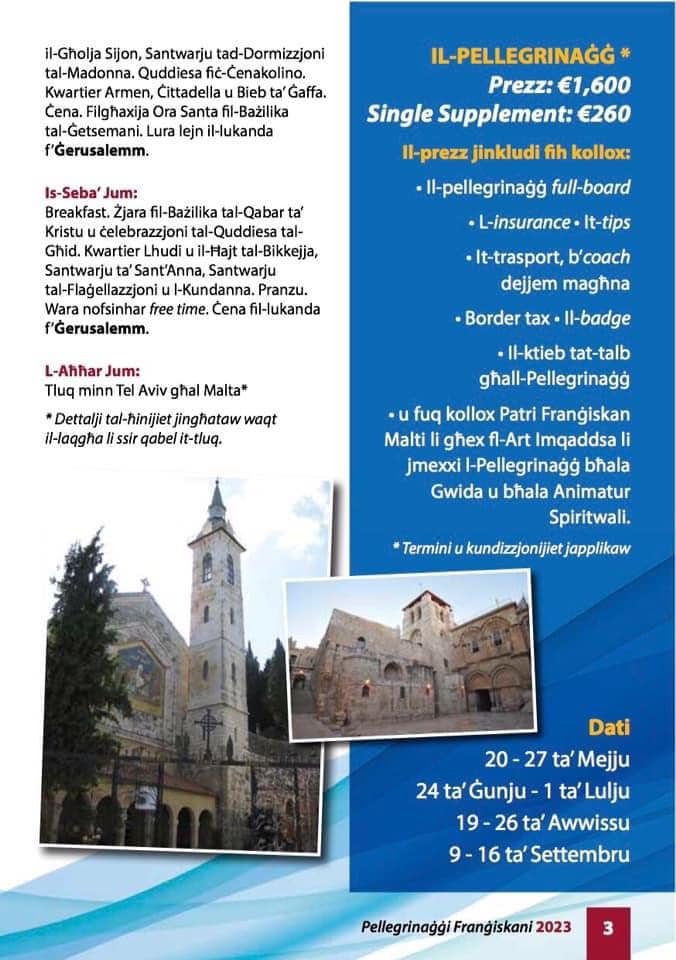 In Malta and Gozo the collection for the Holy Land has been regularly organised for many centuries. The collaboration of the local Bishops and parish priests has been instrumental in making this annual event a great success. In the case of the Archdiocese of Malta the collection is organised once a year in September in all the parishes and churches. In the diocese of Gozo the Commissary goes personally to visit parishes on particular Sundays in order to keep regular contact with the faithful and clergy of the sister island. The generosity of the Maltese people is great and is also the result of the effort of the Holy Land Commissariat to organise pilgrimages in which many members of the clergy have taken part, as well as thousands of Christian faithful.